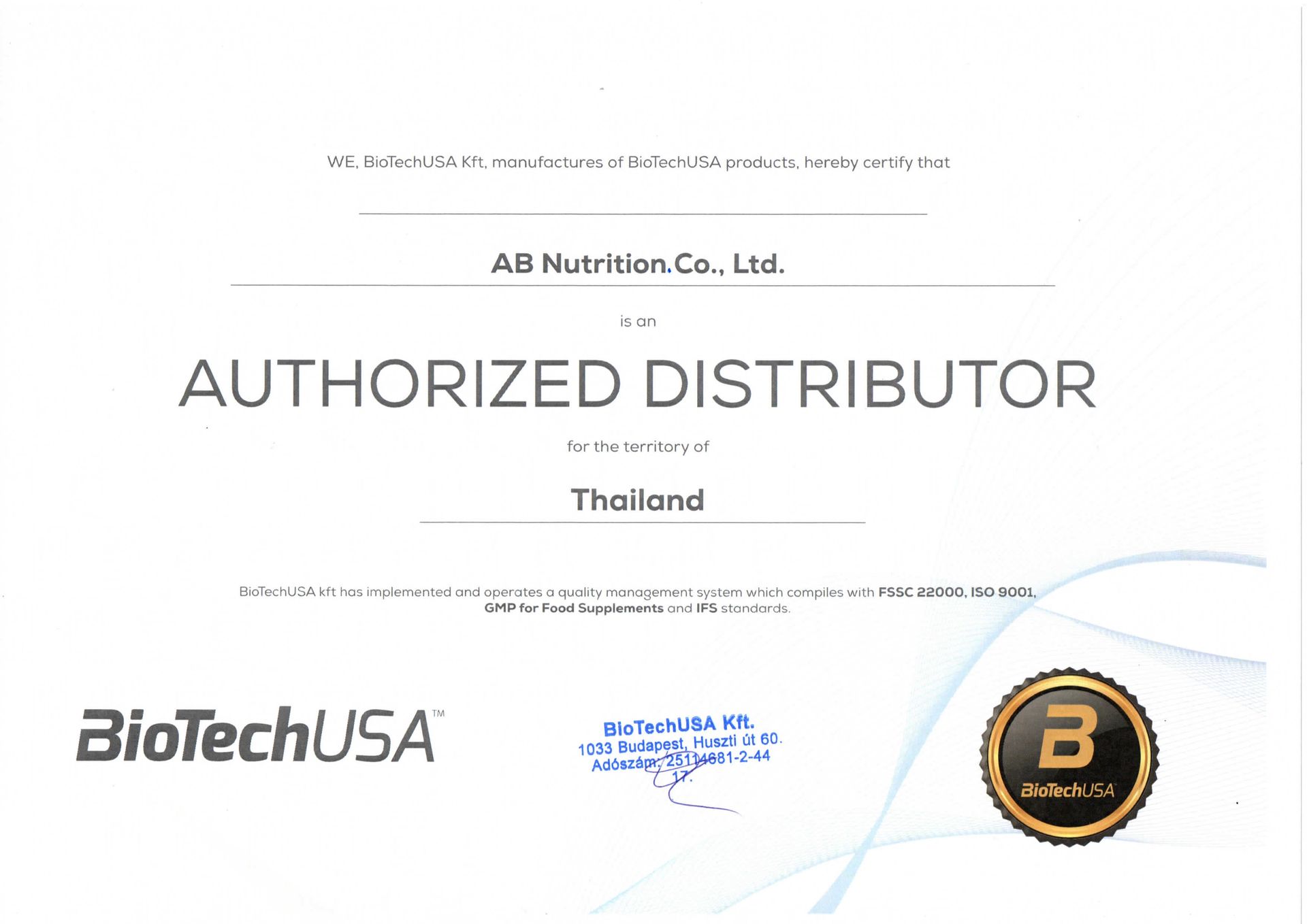 เป็นตัวแทนนำเข้าและจำหน่ายสินค้าแบรนด์ Scitec nutrition และ BiotechUSA แต่เพียงผู้เดียวในประเทศไทย ตั้งแต่ปี 2014 - ปัจจุบัน